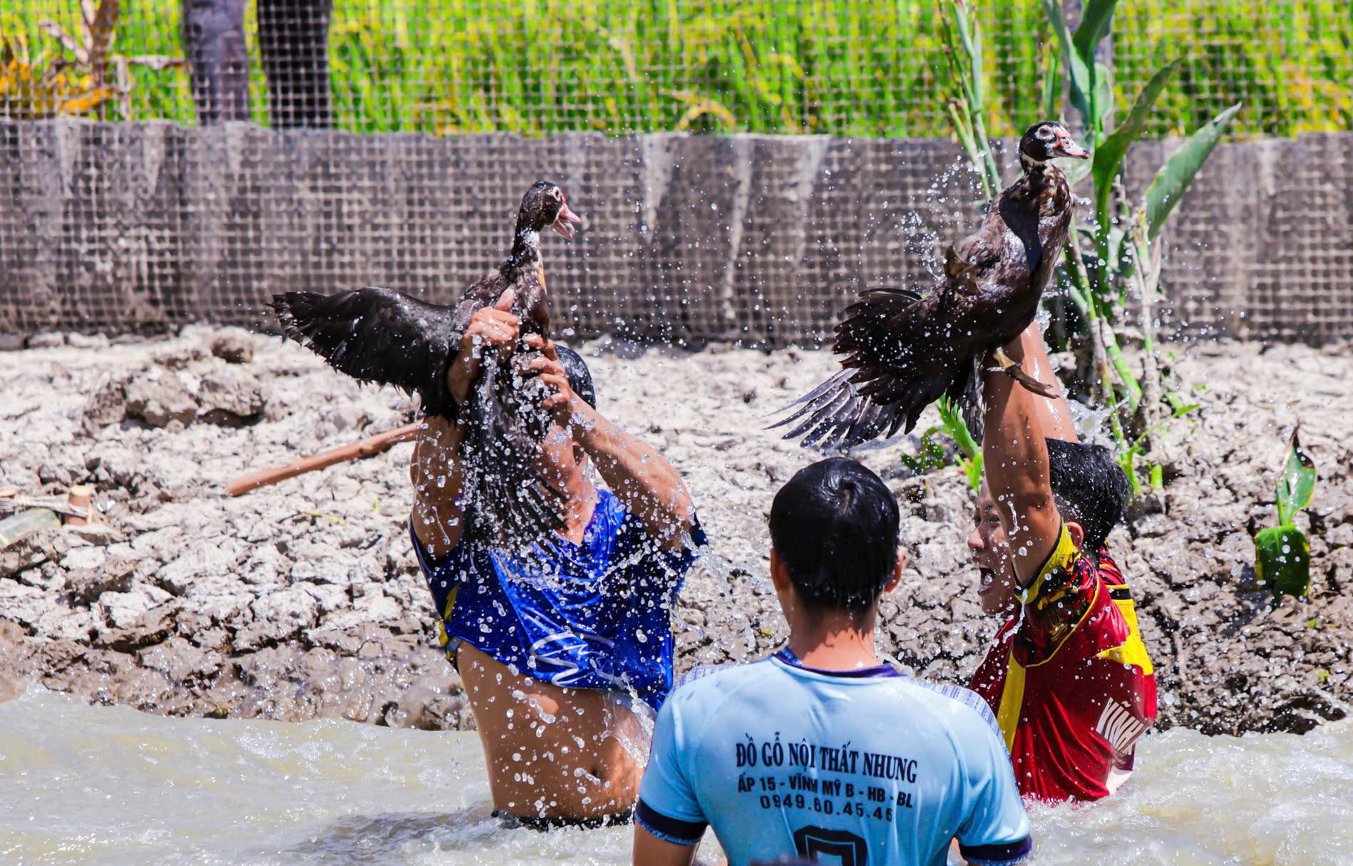 Nhiều người hào hứng với phần thi bắt vịt trên ao, phần thưởng là những con vịt bắt được - Ảnh: THANH HUYỀN